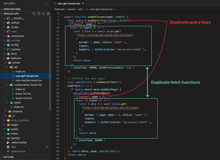 // features/issues/api/use-get-issues.tsimport { useEffect } from "react";import { useQuery, useQueryClient } from "@tanstack/react-query";import axios from "axios";const QUERY_KEY = "issues";// this is also used to generate the query keys in the useResolveIssue hookexport function getQueryKey(page) {if (page === undefined) {return [QUERY_KEY];}return [QUERY_KEY, page];}// shared between useQuery and queryClient.prefetchQueryasync function getIssues(page, options) {const { data } = await axios.get("https://prolog-api.profy.dev/v2/issue", {params: { page, status: "open" },signal: options?.signal,headers: { Authorization: "my-access-token" },});return data;}export function useGetIssues(page) {const query = useQuery(getQueryKey(page),({ signal }) => getIssues(page, { signal }),{ staleTime: 60000, keepPreviousData: true });// Prefetch the next page!const queryClient = useQueryClient();useEffect(() => {if (query.data?.meta.hasNextPage) {queryClient.prefetchQuery(getQueryKey(page + 1),({ signal }) => getIssues(page + 1, { signal }),{ staleTime: 60000 },);}}, [query.data, page, queryClient]);return query;
