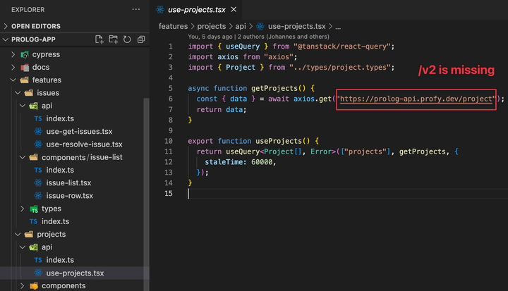 folder that contains a shared Axios instance and react-query client for common config, as well as fetch functions that send the requestsAs a foundation for our refactoring journey, we will take the component below that renders a table of “issues”. It is part of an error-tracking app similar to Sentry that I built for the React Job Simulator.