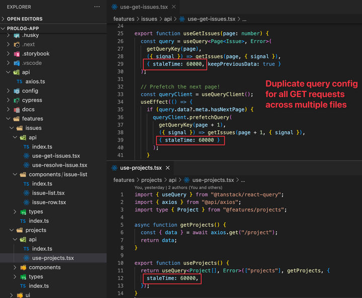 On top of that, some of this code is duplicated even within this component. Each time we use Axios (in the query, prefetch query, and mutation), we retype the complete URL with minor differences, set authorization headers, and use a similar react-query config.