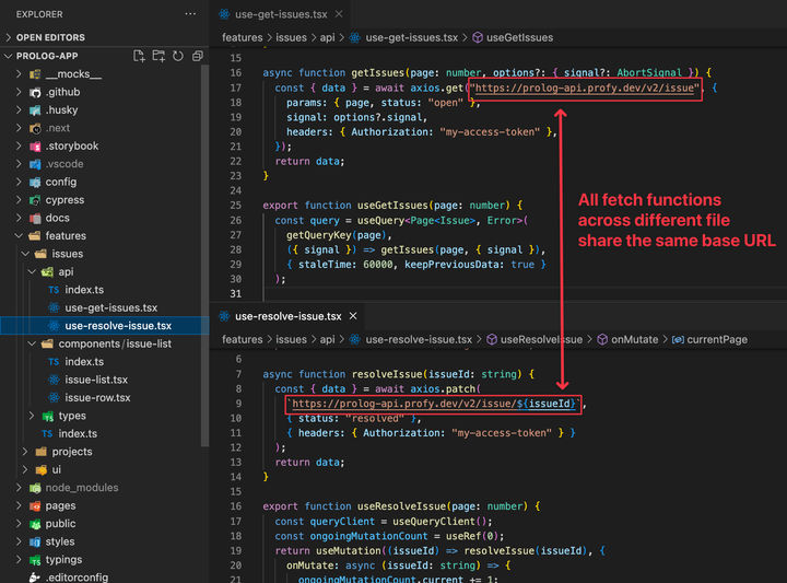 // features/issues/api/use-get-issues.tsimport { useEffect } from "react";import { useQuery, useQueryClient } from "@tanstack/react-query";import { axios } from "@api/axios";import type { Page } from "@typings/page.types";import type { Issue } from "@features/issues";...async function getIssues(page, options) {// no need to add the base URL anymoreconst { data } = await axios.get("/issue", {params: { page, status: "open" },signal: options?.signal,headers: { Authorization: "my-access-token" },});return data;}export function useGetIssues(page) {...}