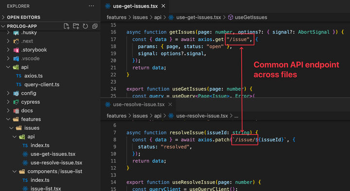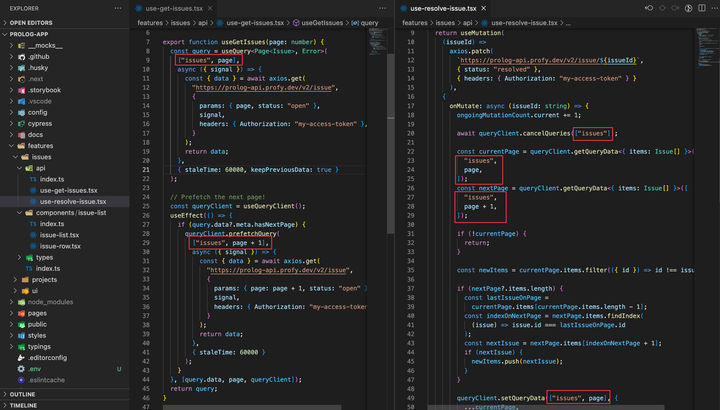 The query keys on the other hand may seem insignificant here. That’s barely code duplication. The problem is that these keys are also used in the useResolveIssue