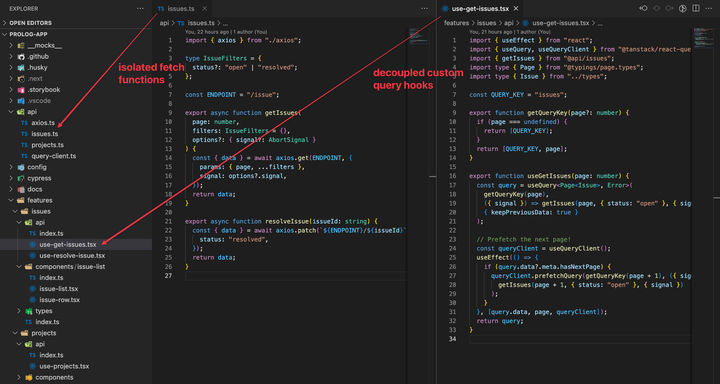 // features/issues/api/use-get-issues.ts...async function getIssues(page, options) {const { data } = await axios.get("/issue", {params: { page, status: "open" },signal: options?.signal,});return data;}export function useGetIssues(page) { ... }
